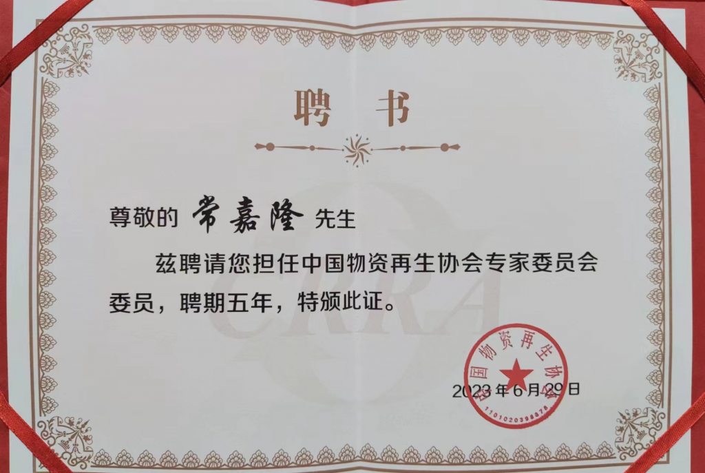万国环保董事长常嘉隆被授予中国物资再生协会专家委员会委员聘书,并且与中国物资再生协会主要领导人进行了密切的交流。