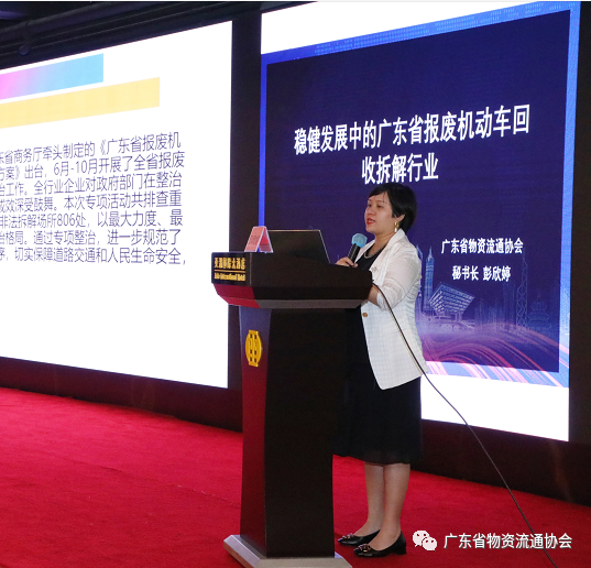 广东省物资流通协会秘书长彭欣婷在大会介绍了我省报废机动车回收拆解行业过去五年的工作概况,包括升级改造工作、配合开展非法拆解打击工作、安全生产管理工作、行业从业人员综合能力提升等方面取得的显著成效。并深入分析了我省报废机动车回收拆解行业当前所面临的困难和挑战,有针对性的提出了解决方案。